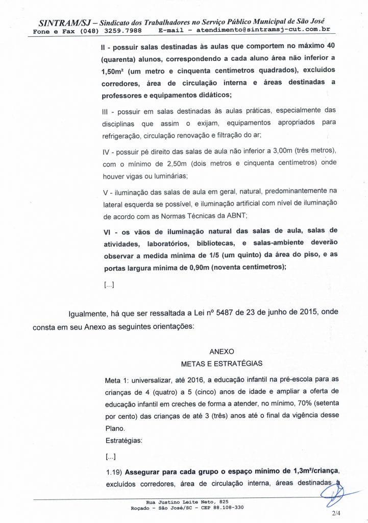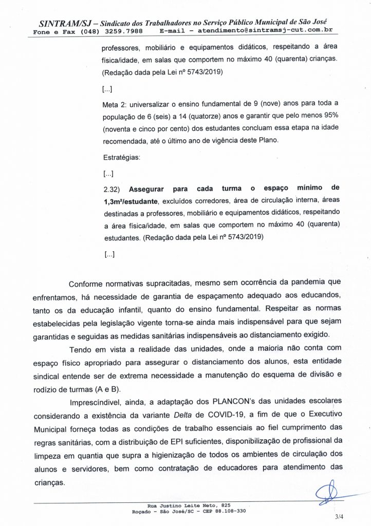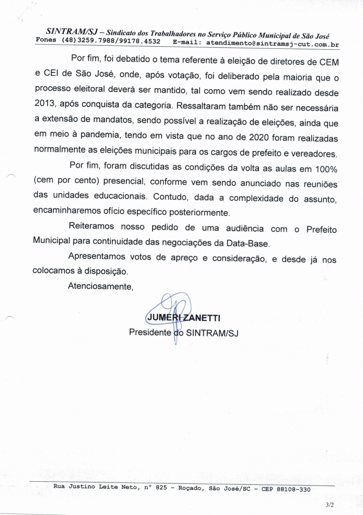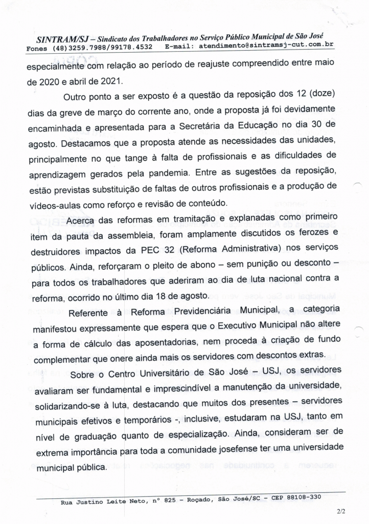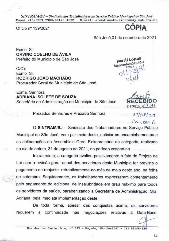 O Sintram-SJ protocolou dois ofícios na Prefeitura Municipal de São José com todas as pautas discutidas com a categoria em assembleia geral realizada no dia 31 de agosto. Entre as pautas, estavam a Revisão Geral Anual, pagamento de insalubridade, volta às aulas e outros assuntos de interesse da categoria.