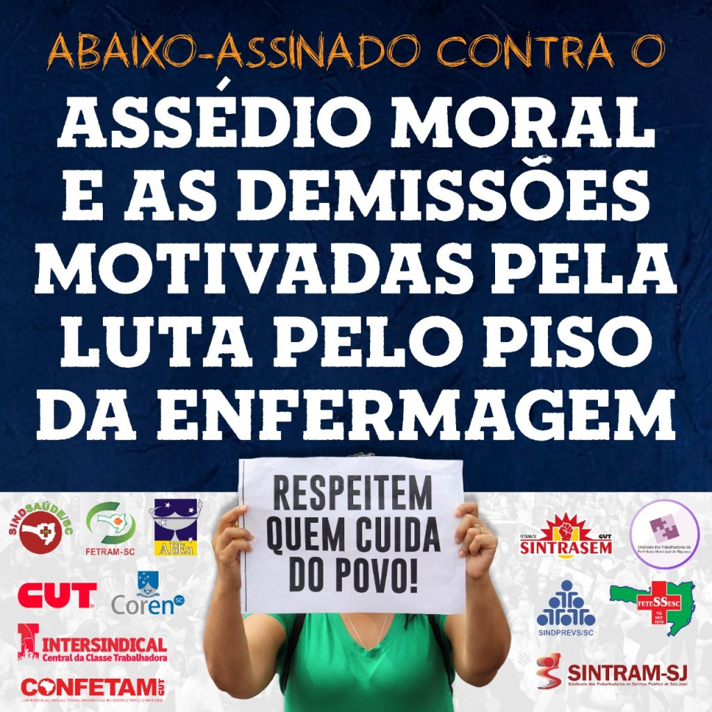 As entidades representativas dos trabalhadores da saúde da Grande Florianópolis vêm por meio deste abaixo-assinado manifestar o repúdio ao assédio moral e às demissões de empregados das empresas que se manifestaram em prol do Piso Nacional da Enfermagem.