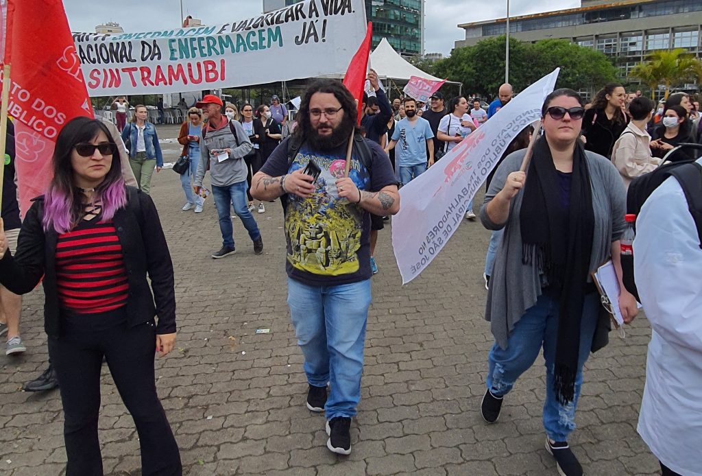 Logo após a assembleia foi realizado um ato em frente aos hospitais Baía Sul e Caridade para demonstrar o descontentamento dos profissionais e protestar contra a demissão de um trabalhador que estava na luta pela implementação do Piso.