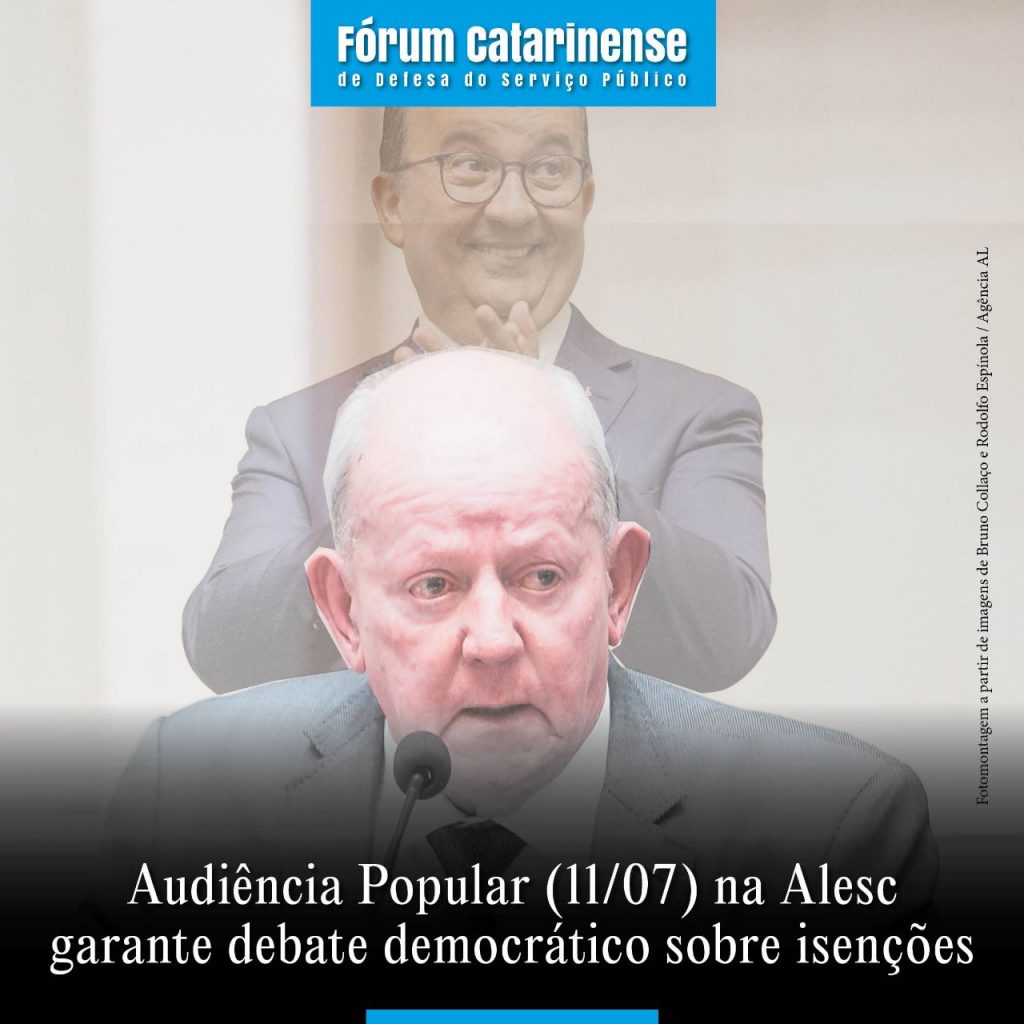 Depois do Deputado Marcos Vieira realizar uma Audiência “Pública” (14/06) que debateu a política de isenções fiscais do Governo de SC só com industriais, agronegociadores e importadores, o Fórum Catarinense e a Frente Parlamentar de Defesa do Serviço Público decidiram organizar uma Audiência Popular sobre o tema a partir das 17h da próxima terça (11/07) no Plenarinho da Alesc.