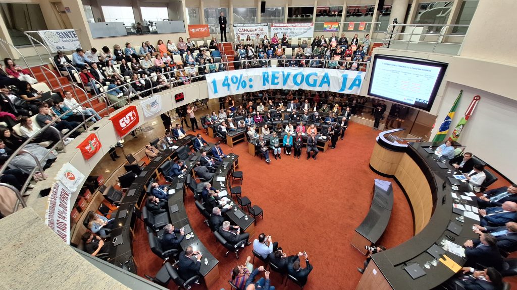 Nesta quarta, 4 de outubro, durante audiência pública da Comissão de Finanças e Tributação, dirigentes das entidades sindicais que representam o serviço público estadual defenderam a revogação dos 14% para parlamentares e trabalhadores que lotaram o plenário e o hall de entrada da Assembleia Legislativa (Alesc).