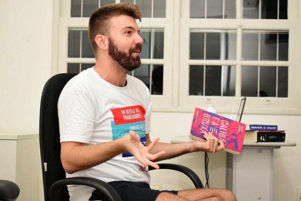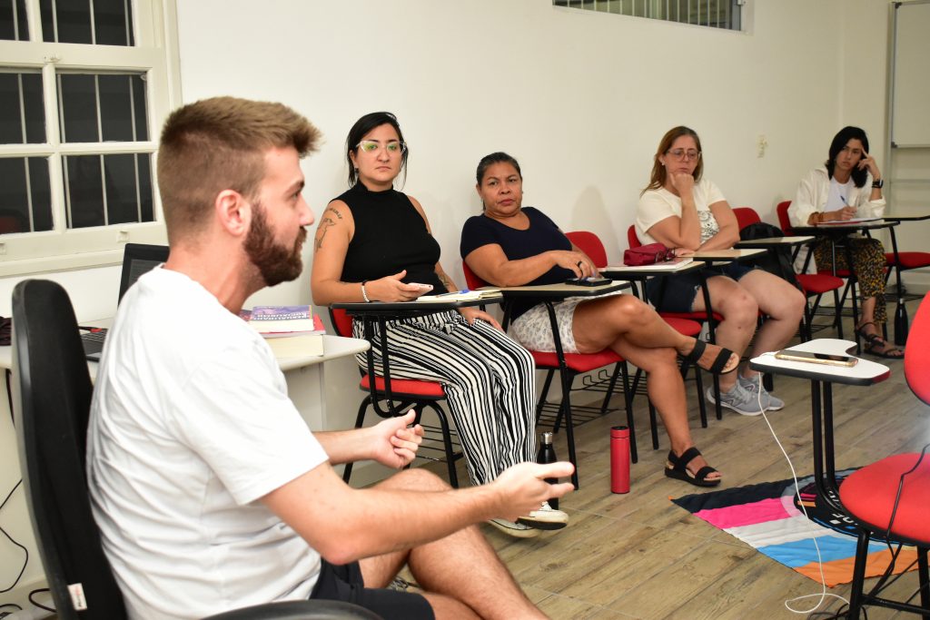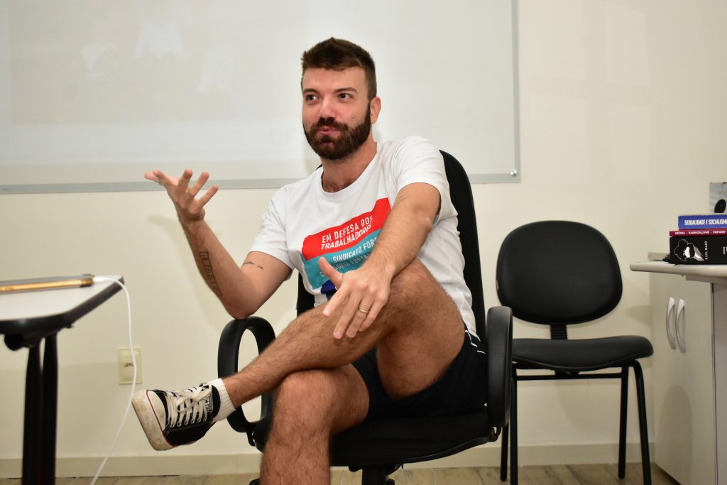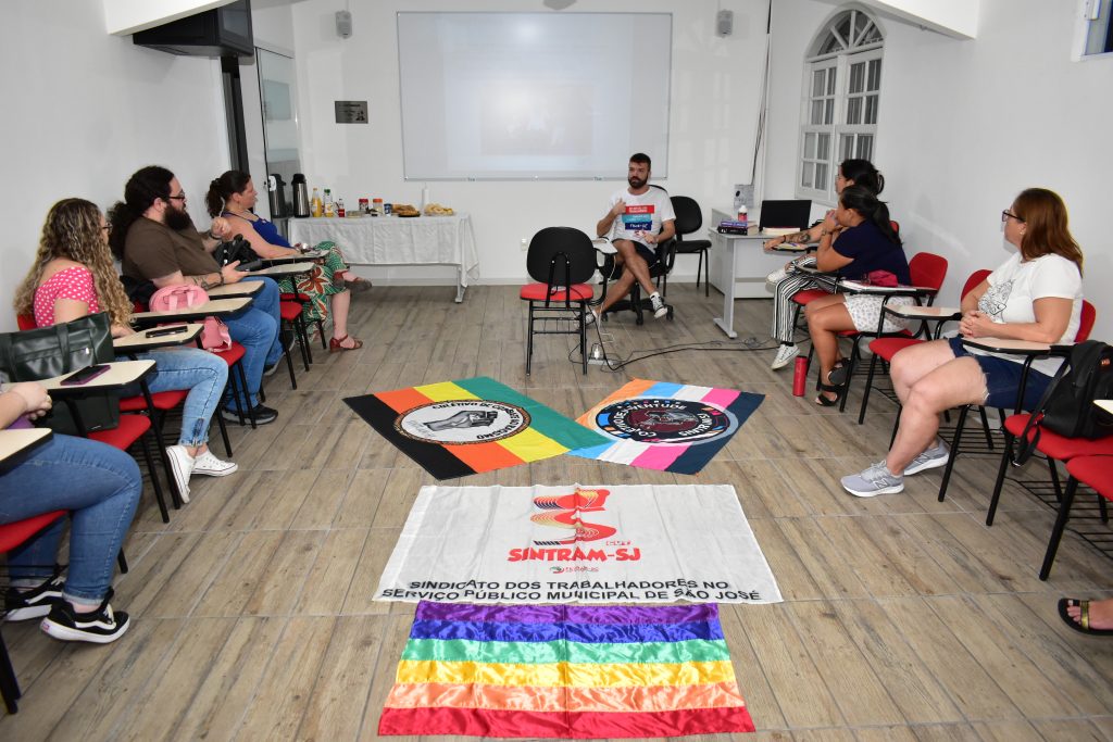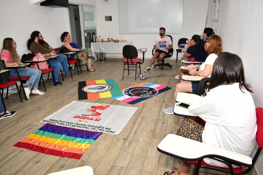 O tema foi debatido a partir da apresentação da pesquisa de mestrado “As contradições das relações entre patriarcado, capital e trabalho expressas na atuação de professores homens na Educação Infantil”, realizada pelo professor da rede municipal de Educação de São José e dirigente do Sintram/SJ, Lucas Kamers de Aguiar, e submetida ao Programa de Pós-graduação em Educação da UFSC, em 2023.