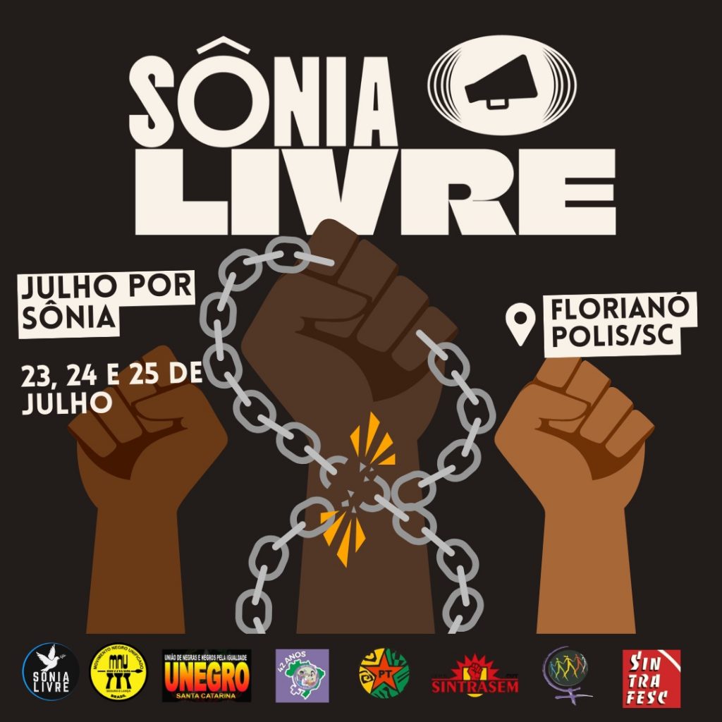 Na luta pela libertação de Sônia Maria de Jesus, mulher negra, pessoa com deficiência, mantida em situação análoga à escravidão há mais de 40 anos na casa do desembargador Jorge Luiz de Borba, em Florianópolis/SC, o Comitê Catarinense Sônia Livre convida a todos para participar das mobilizações do Julho por Sônia Livre.