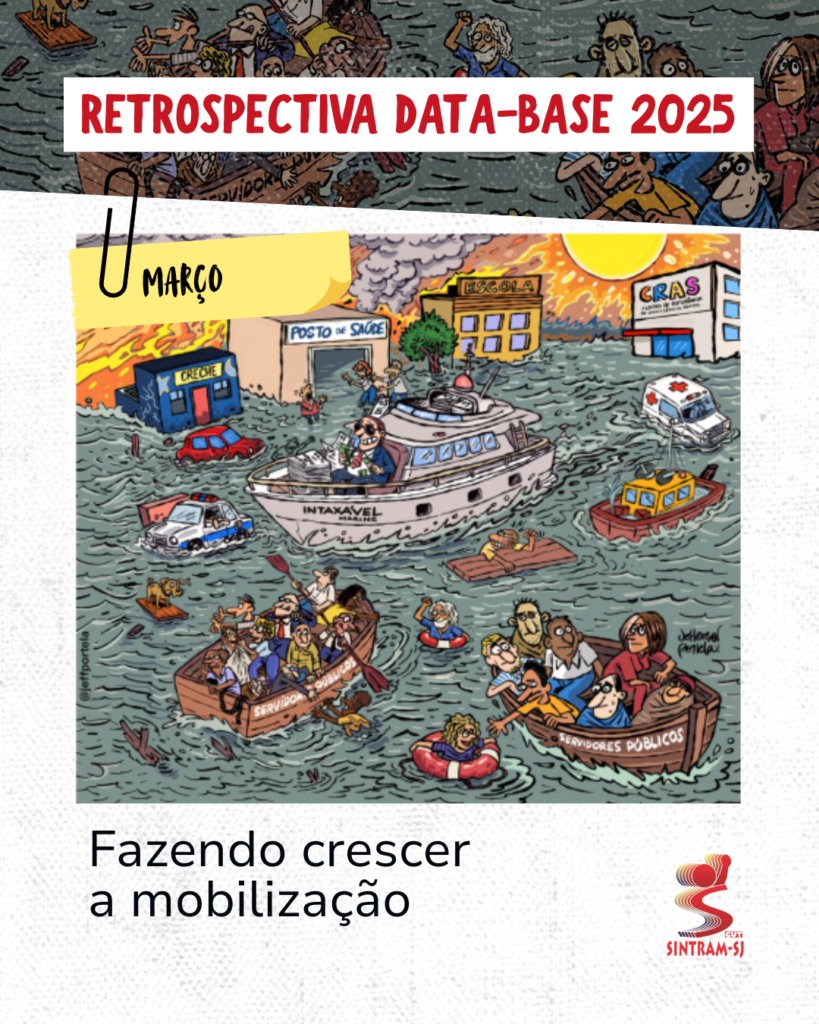 A arte do chargista Jeferson Portela deu cara à nossa luta, ilustrando a identidade visual que nos acompanharia ao longo do ano.